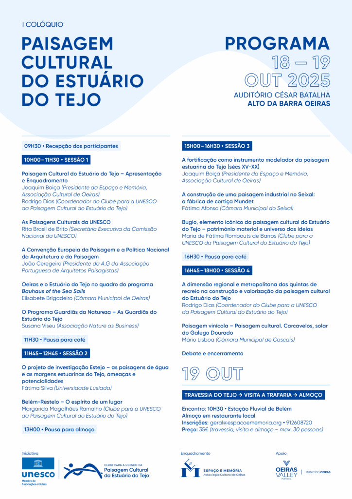 I Colóquio do Clube para a Unesco da Paisagem Cultural da Paisagem Cultural do Tejo, iniciativa enquadrada pela Espaço e Memória, que decorrerá nos dias 18 (no Auditório Municipal César Batalha – Alto da Barra, em Oeiras) e 19 de Outubro (passeio e almoço).