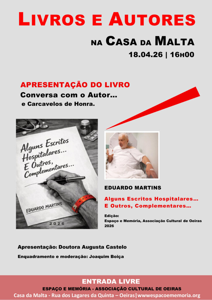 De acordo com os Estatutos, convoco os associados da Espaço e Memória – Associação Cultural de Oeiraspara a Assembleia-Geral Ordinária que se realizará no dia 22 de Janeiro de 2026, pelas 17H30, nas instalações da sede, sita na Casa da Malta, Rua dos Lagares da Quinta, em Oeiras, com a seguinte Ordem de Trabalhos: