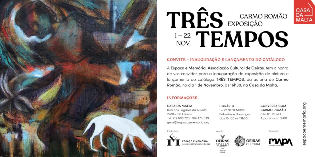 A Espaço e Memória tem o prazer de convidá-los para a inauguração da Exposição de Pintura e lançamento do catálogo TRÊS TEMPOS da pintora Carmo Romão, no próximo sábado, dia 1 de Novembro, pelas 16h30, na Casa da Malta.