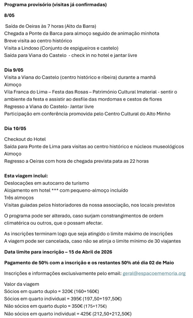 Estamos a divulgar o programa para a nossa visita a Viana do Castelo, Ponte da Barca, Vila Franca do Lima e Ponte de Lima, que ocorrerá nos dias 08, 09 e 10 de Maio.