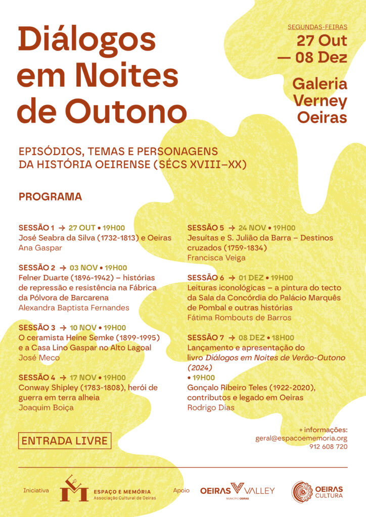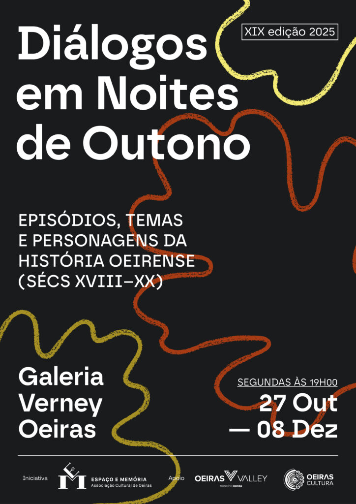 Os Diálogos, que contam com o apoio da Câmara Municipal de Oeiras, terão lugar na Galeria Verney (Oeiras) e, conforme solicitação de vários associados e sequenciando a nossa experiência de 2024, as sessões em 2025 terão início às 19 horas.